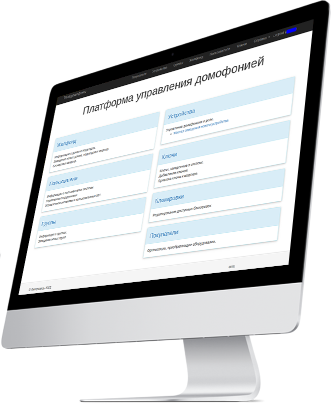 Система управления умными домофонами, калитками, въездами и приложением для пользователей. Платформа дает возможность контролировать все домофоны и настраивать функционал мобильного приложения